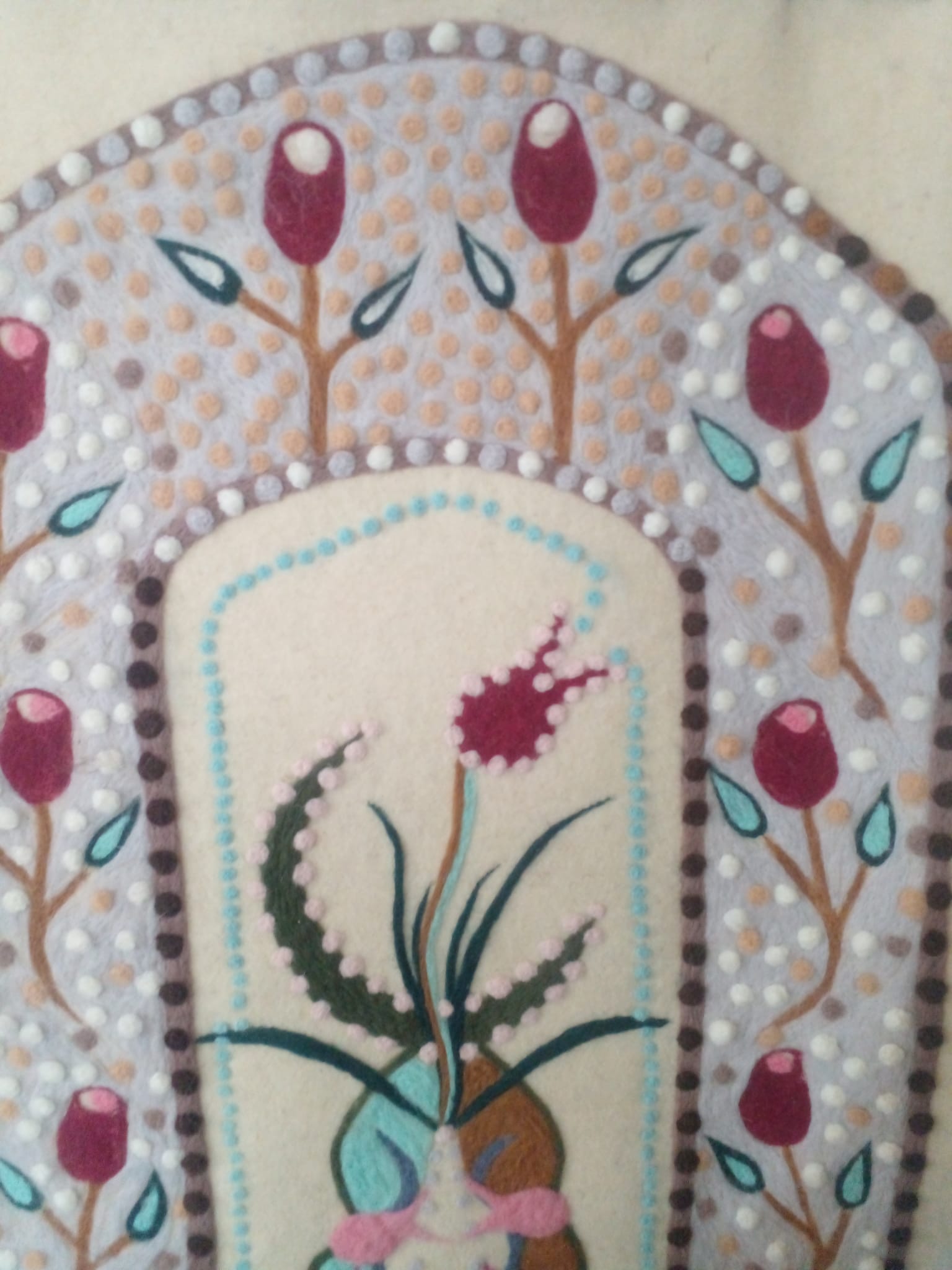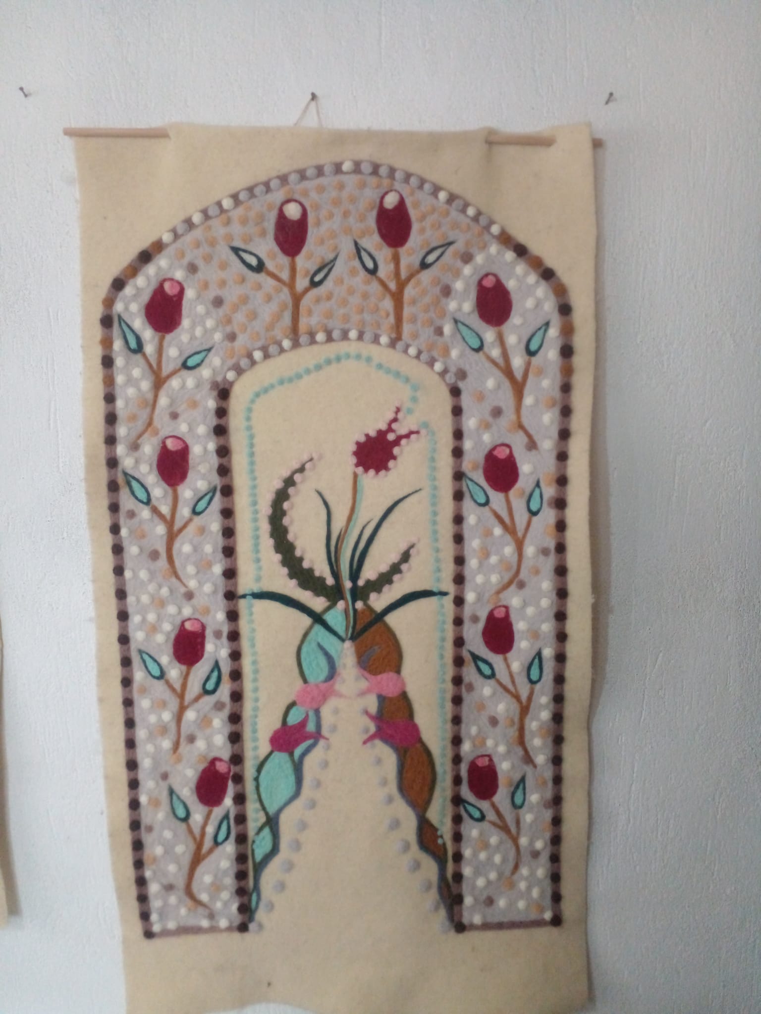 Koyun yünü ile keçe iğneleme yöntemi ile yapılmıştır. 70×125 cm ebatında